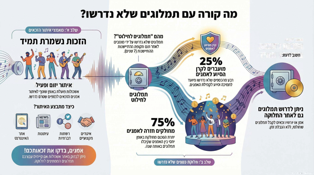 מדי שנה אנו מחלקים את התמלוגים של האמנים שלא אותרו ונצברו להם תמלוגים לפני 7 שנים, לאמנים אשר ידועים ומוכרים לאשכולות, כאשר לאומנים שלא אותרו עומדת הזכות לקבל את התמלוגים ש"נלקחו" להם ברגע שהם מגיעים לחברה. נוהל זה הינו בהתאם לפס"ד בת.א 40768-07-22 (בקשה למתן הוראות לנאמן מטעם אשכולות).